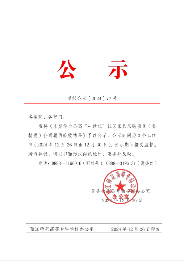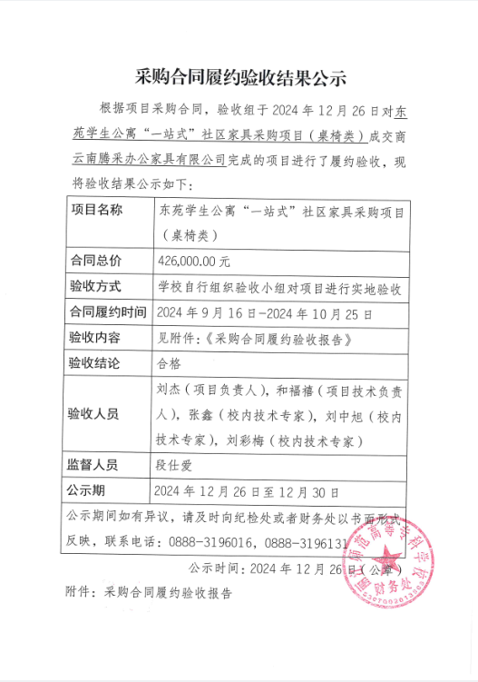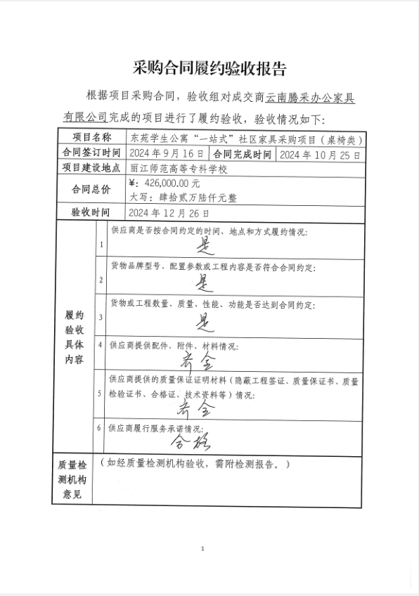 丽江师范高等专科学校东苑学生公寓“一站式”社区家具采购项目(桌椅类)合同履约验收结果公示